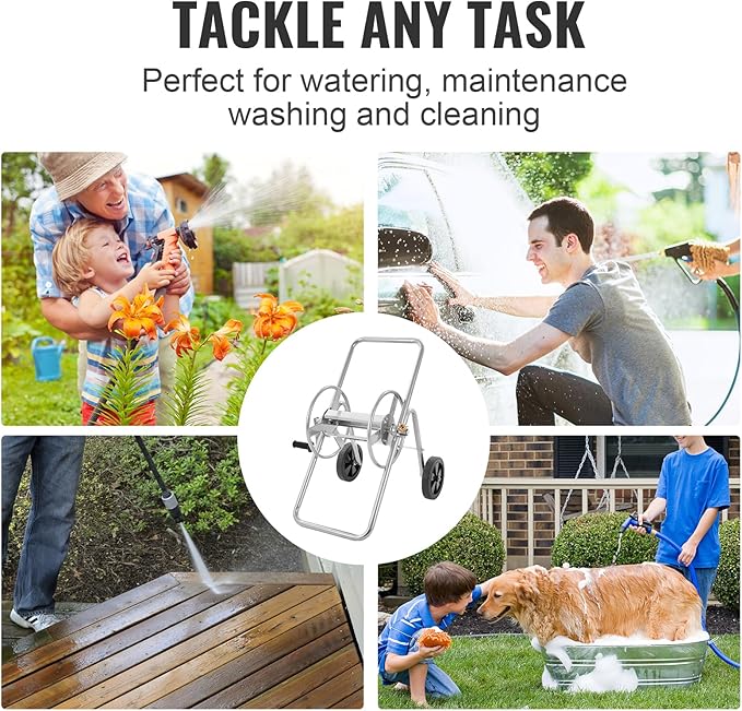 • Versatile Application: The water hose reel cart is widely used in residential gardens for various purposes such as watering plants, maintaining lawns and grassy areas, irrigation in agriculture and farming, vehicle washing, general cleaning, and other outdoor activities.