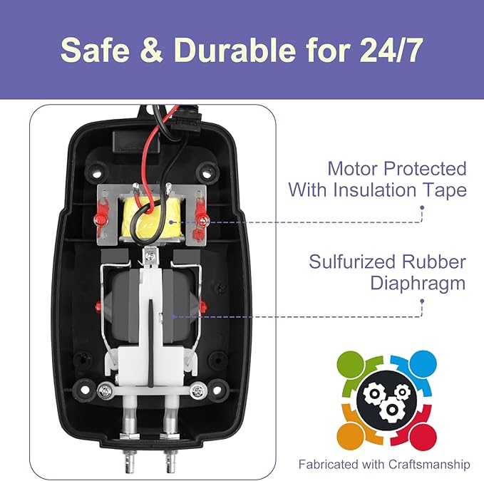• SAFETY & DURABILITY - The sulfurized diaphragm of this pond bubbler enhances its durability, ensuring long-lasting performance. Additionally, the chrome-plated air outlets are corrosion-resistant, further contributing to the pump's durability and longevity.