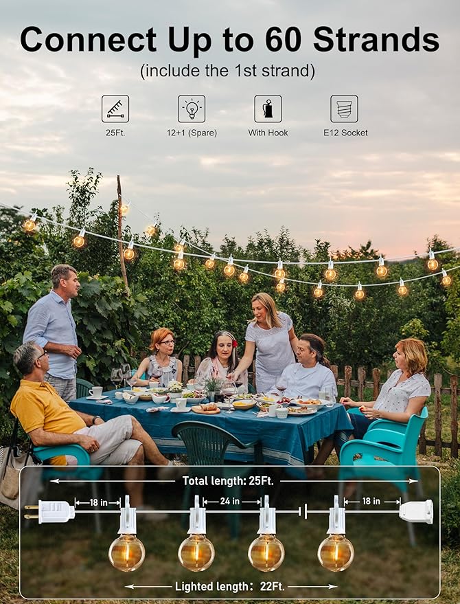 • Connectable & Portable: 12 hanging sockets, 18 inch lead with male plug, 24 inch spacing between bulbs, 18 inch tail with female connector, total length 25 feet. End to end connect up to 60 strands (include the 1st strand). Portable size for easy carrying and storage