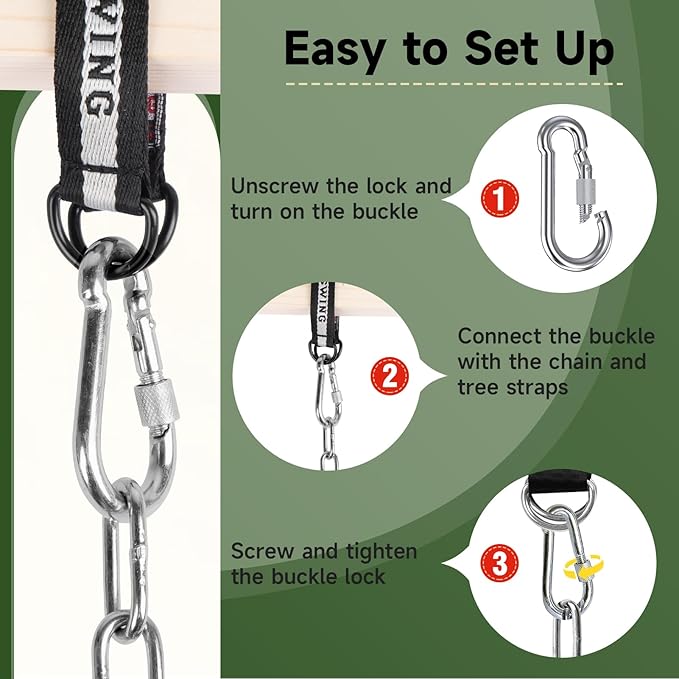 • 【Quick Snap Hook Installation 】Preassembled buckles and snap hooks allow attachment in seconds – no tools needed! Adjust chain length from 30" to 66" for backyard tree, home porch, garden fixed beams, school playgroud.
