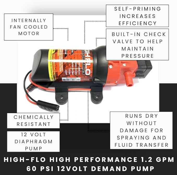 • DEPENDABLE PUMP OUTPUT: High-Flo 12V pump delivers 1.2 GPM at up to 60 PSI, offering smooth, steady performance for consistent application in any terrain