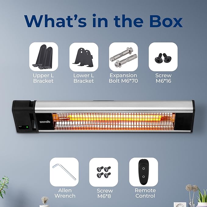 SereneLife Infrared Patio Heater, Wall-Mounted Electric Heater with Remote, 1500W, IP65 Approved, Odorless, Indoor/Outdoor for Patio, Restaurant, Backyard, Garage, Decks