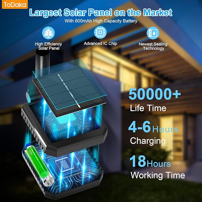 • 【Quicker Charging & Longer Lasting】- Garden lights featuring monocrystalline silicon solar panel with the highest photoelectric conversion efficiency (up to 26%), they are faster charging than the ordinary solar lights for outside. Built-in 600mAh Ni-MH battery, our solar lights produce brighter yard decor for up to 18 hours after just 4-6 hours charging.