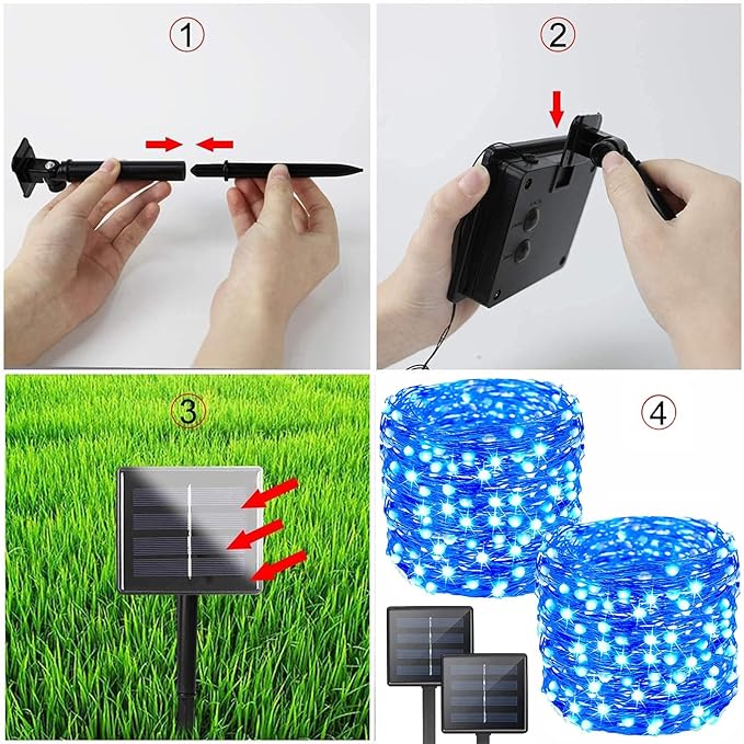 • [Solar Powered & Auto On/Off]: These blue solar lights are powered by a high-efficiency solar panel. After 8 hours of charging in full sunlight, they run for 10–12 hours at night. Lights turn on automatically at dusk and off at dawn—no wiring, no electricity cost, just clean energy and lasting brightness.