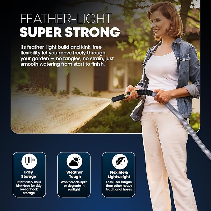 • [Feather-Light, Super Strong] Redefining watering with its incredibly lightweight design, experience unmatched watering efficiency with our Titan garden hose. When paired with our precision-engineered nozzle, this hose delivers exceptional pressure for everyday watering tasks while saving you water. Ideal for garden maintenance, vehicle cleaning, RV, marine use and more, for a powerful and consistent water flow.