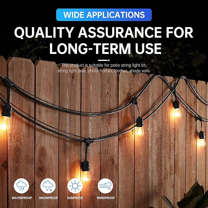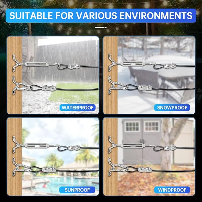 • 【Easy to Install 】:Guide Wire for Outdoor String Lights Each Part is Threaded, and Our Wire Rope Kit Includes Simple Tools to Assist in the Installation, to Better Secure All the Accessories, Easy to Assemble or Disassemble, Reusable. The Double Rope Clips Inside Our Steel Cable Kit Hold the Wire Rope more Securely than Single Rope Clips, and The M5 Turnbuckle are Adjustable in Length, Allowing You to Easily Install the String Lights on Wood, Timber or Concrete Walls.