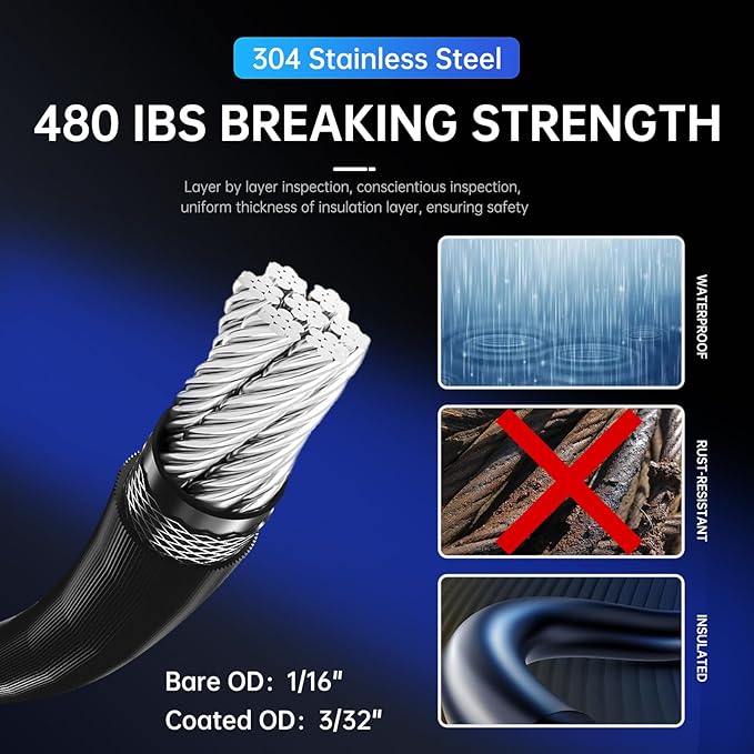 • 【304 Stainless Steel Cable 】:The Wire Cable Bare OD is 1/16", Coated OD is 3/32", Made of 304 Stainless Steel,480 lbs Breaking Strength,7Γ—7 Strands Core , There are 7 Strands and Each Strand Contains 7 Individual Stainless Steel Wire, and Consists of One Strand of Very Strong Corrosion Resistance, Durability, and is a Moderately Flexible Cable Wire Rope, ideal for Rigging Applications that Require a Certain Degree of Flexibility ,and Suitable for All Kinds of Weather.