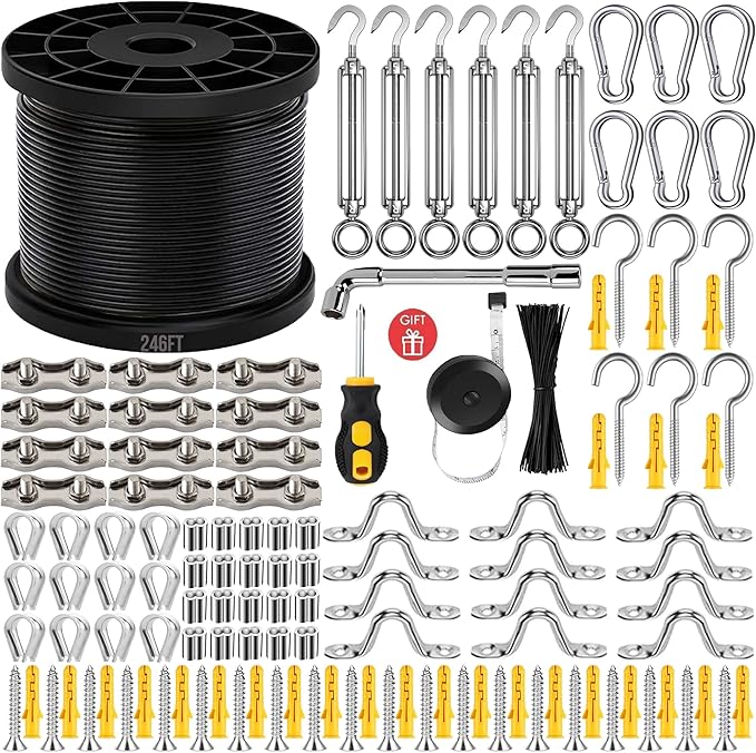 • 【Multi-purpose Cable Kit 】:Suitable for Sun Shade Hardware Kit , Garden Wire for Climbing Plants,Clothesline Wire, Suspension Wire Kit,Globe Lights Hanging, Espalier Wire Kit,Guy Wire Kit,Gate Tensioner Cable Kit,Curtain Cable Wire System ,Outdoor Applications of Tent Rope, Deck Cable Railing and etc.