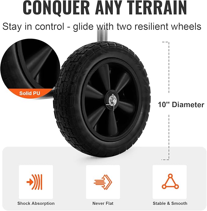 • Stable Mobility: A low center of gravity is beneficial in preventing tipping. The garden hose reel cart is equipped with four solid 10’’ PU wheels that are durable and suitable for various terrains. These wheels ensure effortless and smooth movement of the cart, even on rough or uneven ground.