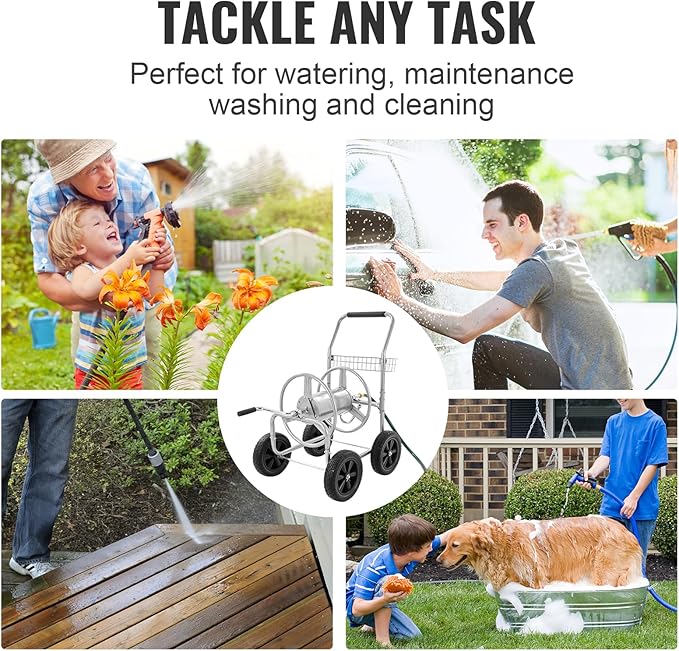 • Versatile Application: Adding a storage basket to the hose reel cart offers a convenient way to keep your gardening tools and accessories organized and within reach. The water hose reel cart is perfect for watering plants, cleaning and maintenance tasks, bathing pets, or other outdoor activities.