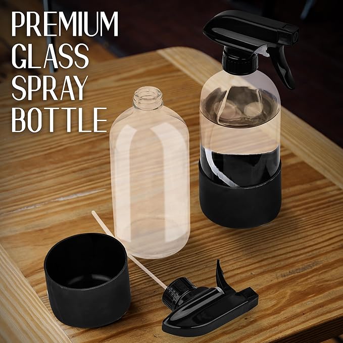 16oz Empty Glass Spray Bottle with Silicone Sleeve Protection - Refillable Containers for Cleaning Solutions, Essential Oils, Misting Plants - Including 2 Sprayers (Clear, 1 PACK)