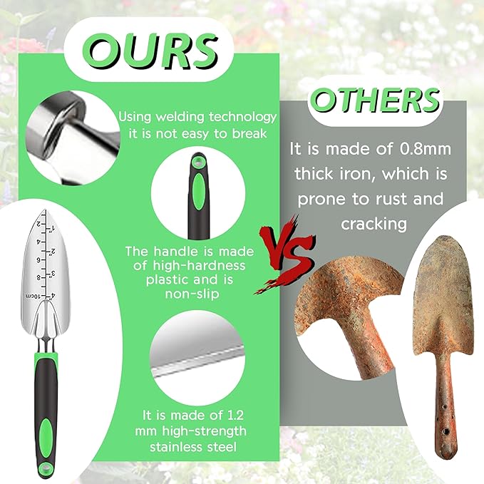 • Ergonomic Handle: After continuous testing by garden engineers, we combined our experience to design this more comfortable and labor-saving anti-slip TRP handle. Whether for children or seniors, the ergonomic design makes digging, carrying, weeding, planting, and pruning easier with these gardening hand tools, reducing hand pain and fatigue, their intuitive design provides Plenty of leverage. And we are equipped with gardening gloves, which can protect your hands very well.