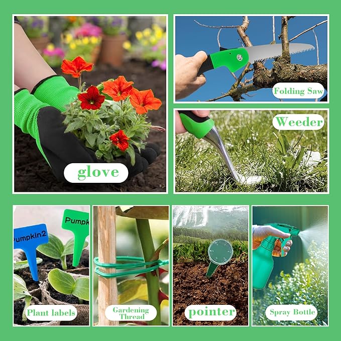 • Complete Gardening Tool Set: This landscaping tools set contains everything you need for daily garden maintenance. Includes hand trowel, transplanting trowel, garden rake, garden fork, saw, weed eater, weeding knife, and pruners, plus 10 tags, zip ties, seeder, watering can, gardening gloves, and stylish and durable gardening tote, This is a complete green team.