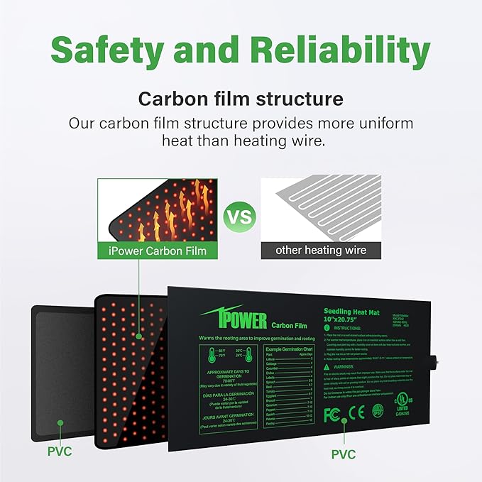 • Reliable heating: the mat is made of upgraded heating film, professionally ensuring uniform heating. The mat warms root area 10-20℉(5-11℃) over the ambient air temperature, perfect for seeding and cutting propagation,