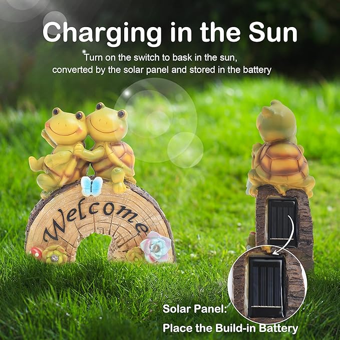 • 【Cute Lawn Decor】Frog Face Turtle solar statue is a great decoration for garden/ balcony/ patio/ yard/ lawn/ fence/ walkway, Frog-faced turtles sit on stumps and watch will make you welcoming us home every time you look them