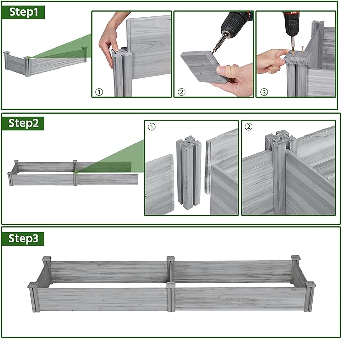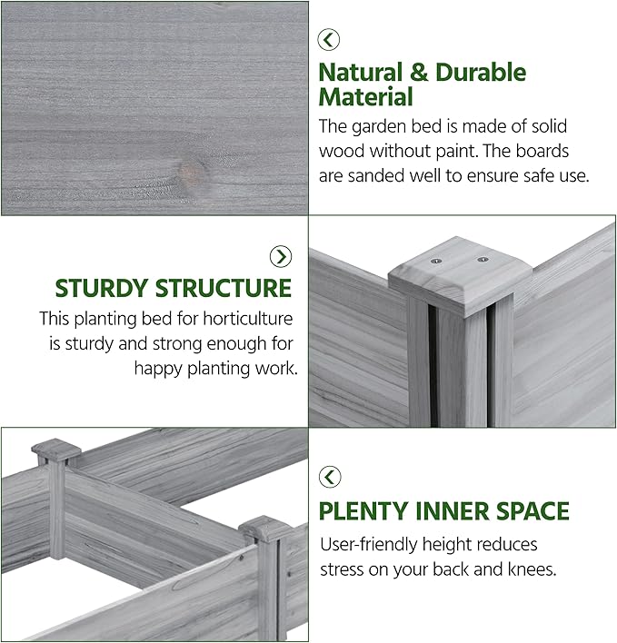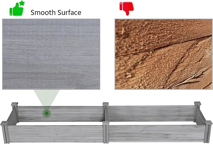 • SINGLE-PIECE SIDE PLATE -- Comparing to other planting beds that have several small pieces of wooden plates at the side, our planting raised bed has a piece of complete side plate at each side of the garden bed. It is fixed firmly without leakage of soil. The whole structure is simple but stable for easy usage