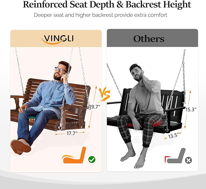 • Upgraded Product Size - We add the seat depth and backrest height on our swing bench, only to better support your body and bring more relaxation. Seat Depth = 21.7” and Backrest Height = 19.7”
