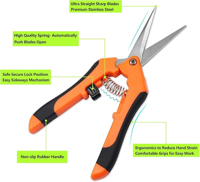 • Garden Scissors Hand Pruner: Reduce Hand Strain, Ultra Sharp Blades, Secure and Easy to Lock, Make Precise Cuts with Straight Stainless Steel Blades; 6.5 Inch plant shears, perfect as flower scissors trimming trees, shaping roses, annuals, vegetable, bonsai gardens. Plant scissors pruning pruners gardening garden clippers.