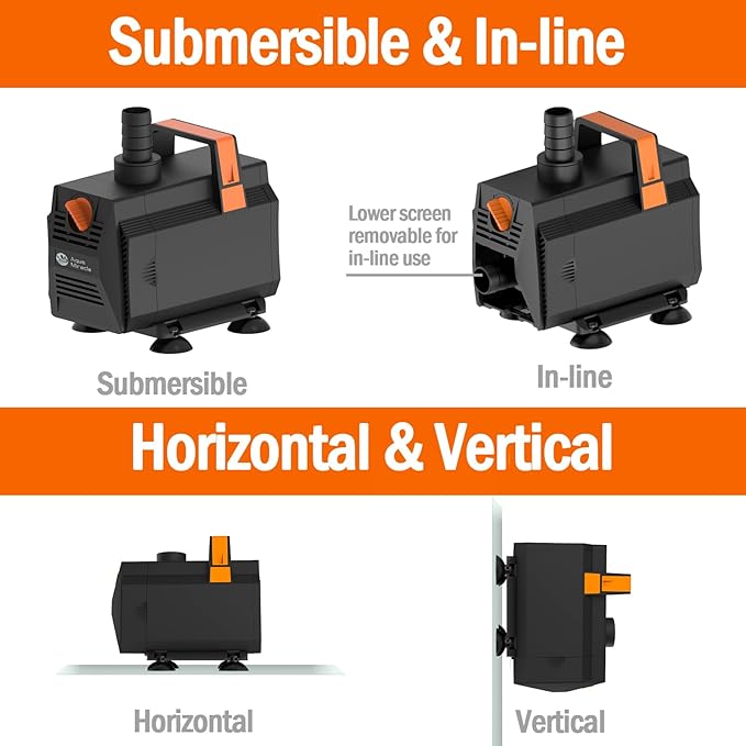 • HANDY AND EASY TO MAINTAIN – 1. This fountain pump is designed with a handle for ease of carry. 2. Lubricant free and no special tool is needed for maintenance. Simply pull to detach the front screen from the submersible water pump and rinse the components with water.