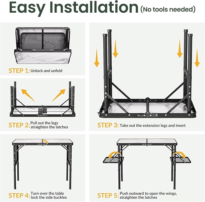 • Simple 5-step Installation (No tools needed). Step 1: Unlock and unfold. Step 2: Pull out the legs and straighten the latches. Step 3: Take out the extension legs and insert. Step 4: Turn over the table and lock the side buckles. Step 5: Push outward to open the wings, straighten the latches. Done. Please refer to the installation steps in the picture.