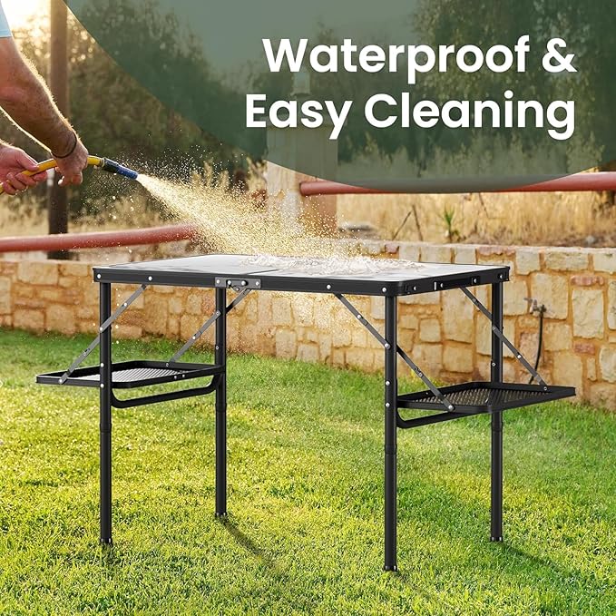 • Lightweight & Strong Load-bearing. Our camping table is made of 90% aluminum & 10% density board, ensuring that it is light and strong at the same time. The picnic table is 12lbs heavy and supports up to 80 lbs, and each wing supports up to 30 lbs.