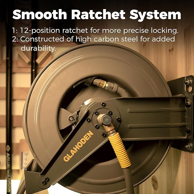 • Heavy Duty Double Arm All-steel Construction: GLAHODEN air compressor hose reel retractable is compact and virtually indestructible by using 0.04 in thickened steel and 0.15 in thick support arm. The high quality powder coated surface is extremely durable and always looks like new (weighs 36.7 lbs, please install on a sturdy surface).