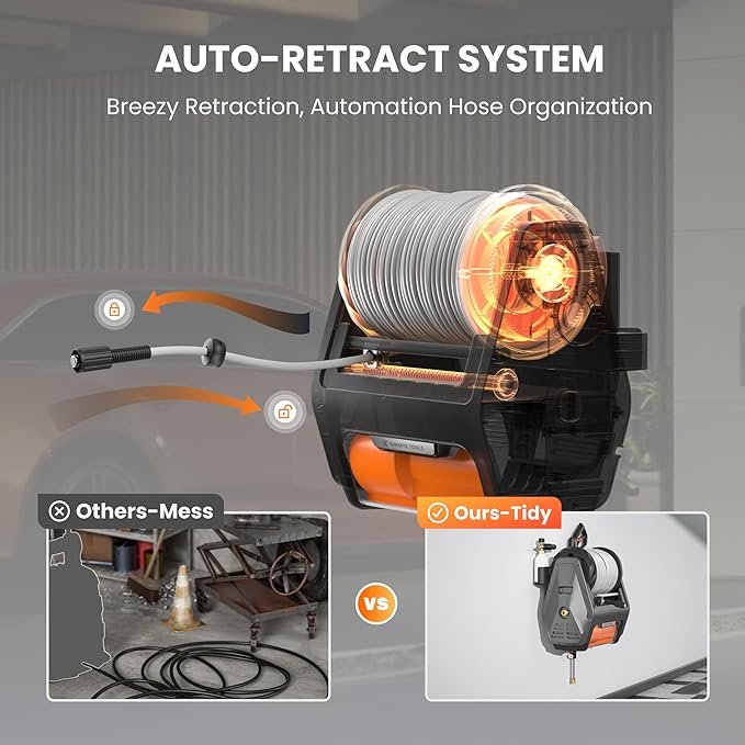 • Stable Auto Rewind: Give the hose a gentle tug, the pressure washer reel will retract automatically back in. The retractable system makes storage easy and is designed to protect the pressure hose from kinks, snags and tears, and makes rewinding and unwinding simple. Save your time and effort