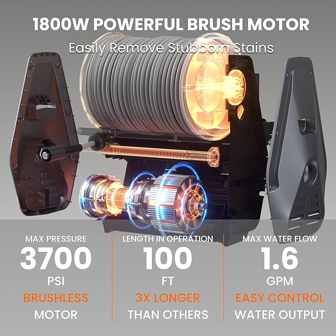 • Powerful 1800 Watt Induction Motor: Generates up to 3700 psi of water pressure and 1.6 gpm of water flow for handling even the most stubborn grime quickly and effortlessly. Tackling tough tasks such as tar, grease, oil stains, rust, and stubborn grime is effortlessly accomplished