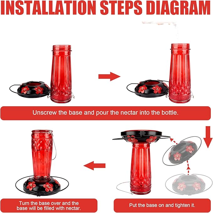 • EASY TO REFILL AND CLEAN: Humming bird feeder wide mouth bottle design, transparent glass, the feeder is easy to disassemble and assemble.