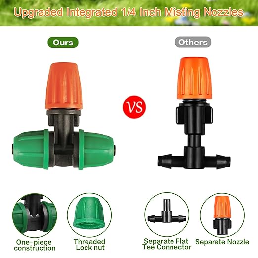 • 【PACKAGE LIST】It comes with 18pcs couplings,15pcs tees,12pcs end caps,10pcs elbows,5pcs cross connectors,and 5pcs misters nozzles. The barb design is for a secure leak-proof connection and the twist lock adds extra hold to the tubing for a secure connection.