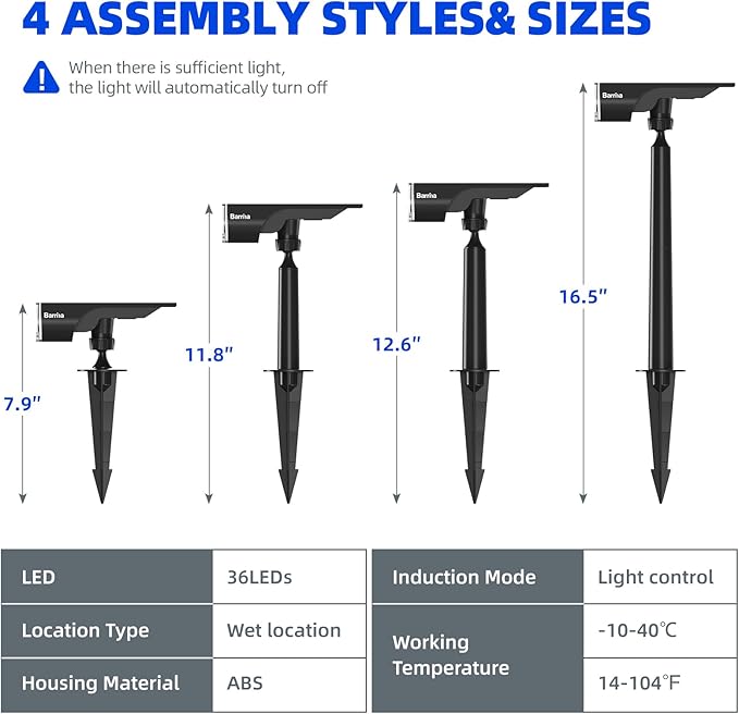 • 36 LEDS Excellent Spotlight Effect: unique design of Barrina solar spot light outdoor focuses more light, illuminates your garden and patio with more brightness and wider range.Featuring an upgraded silicone solar panel with a photoelectric conversion rate of up to 22.5%, our solar spotlight charges faster and delivers higher quality light