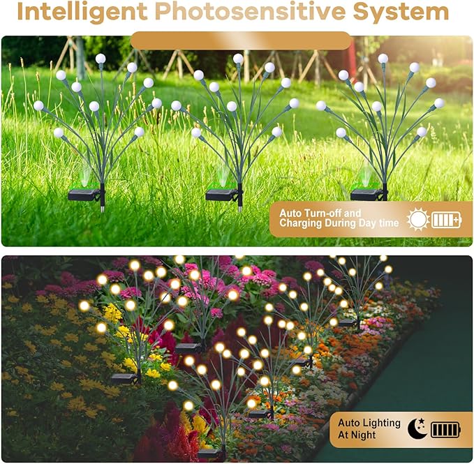 • Upgraded Larger Size Solar Panels - Our solar firefly garden lights upgraded by using monocrystalline solar panel, the solar energy conversion efficiency up to 25.7%, exceeds 99% solar charging efficiency on the market, worry-free charging even on cloudy or short winter days. Built-in 600mAh Ni-MH batteries, sustain up to 20 hours of work after being fully charged, lighting for all night long.