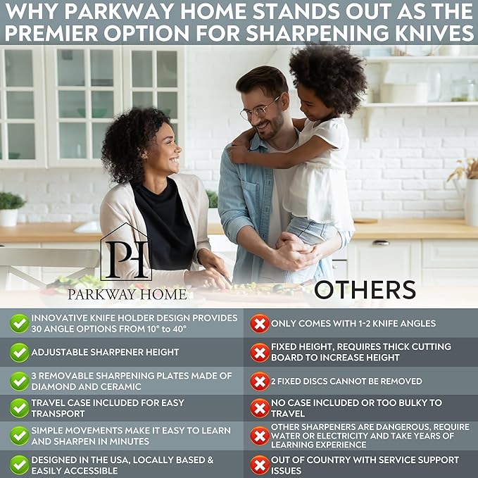 • 📏 DIFFERENT KNIVES HAVE DIFFERENT HEIGHTS: You can easily adjust the height of the sharpening plate with our patent pending height adjuster, perfect for large cleavers or butcher knives. No extra cutting board to raise height needed here!