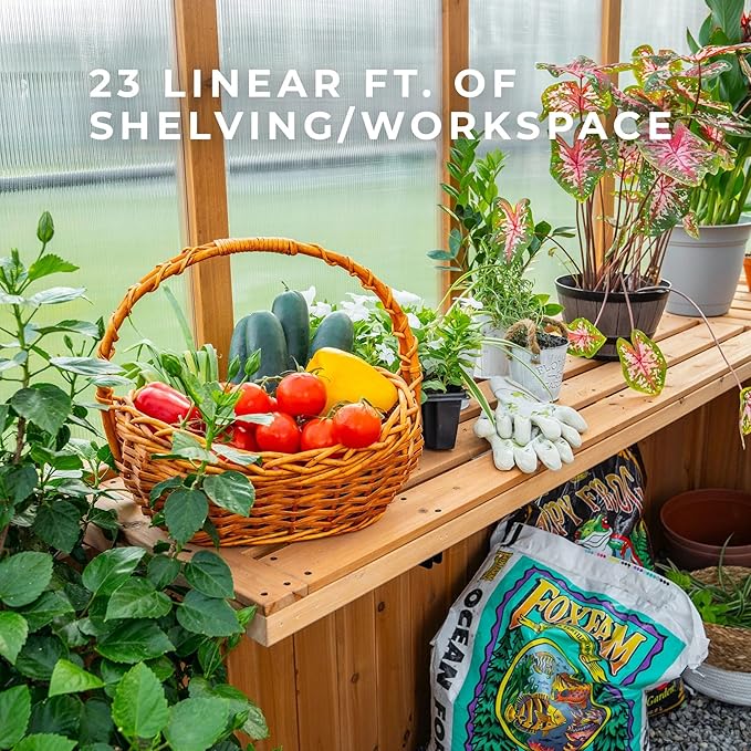 • Spacious Interior: 86 square feet of interior space with a built-in workstation offers 23 linear feet of foldable and fixed staging shelves to suit your gardening needs