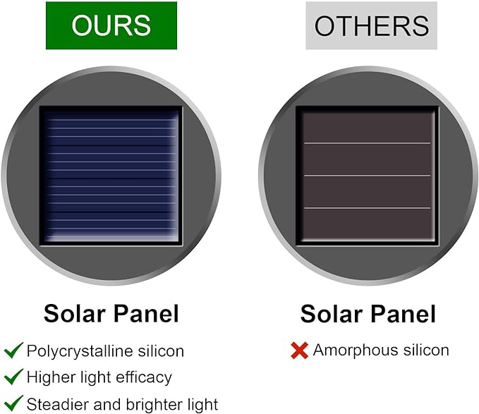 • 【Better Solar Panel】Unlike other outside solar hanging light panels made of Amorphous silicon, Our solar lights are made of Polycrystalline silicon which has higher light efficacy. With the same charging hours, our solar panels can save more electricity in the daytime and casts brighter and steadier glow at night.