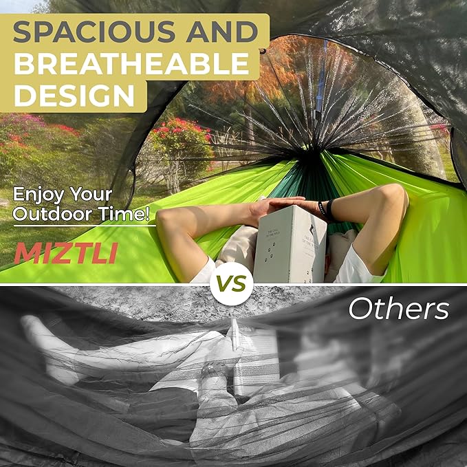 • Revolutionized Comfort in the Great Outdoors - Experience the ultimate outdoor relaxation with MIZTLI's new upgraded Camping Hammock with Net (The hammock net is not removable). This double &single hammock offers unique design creating a tent-like space. Enjoy ample room without the net touching your face. Enjoy the beauty of nature without compromise