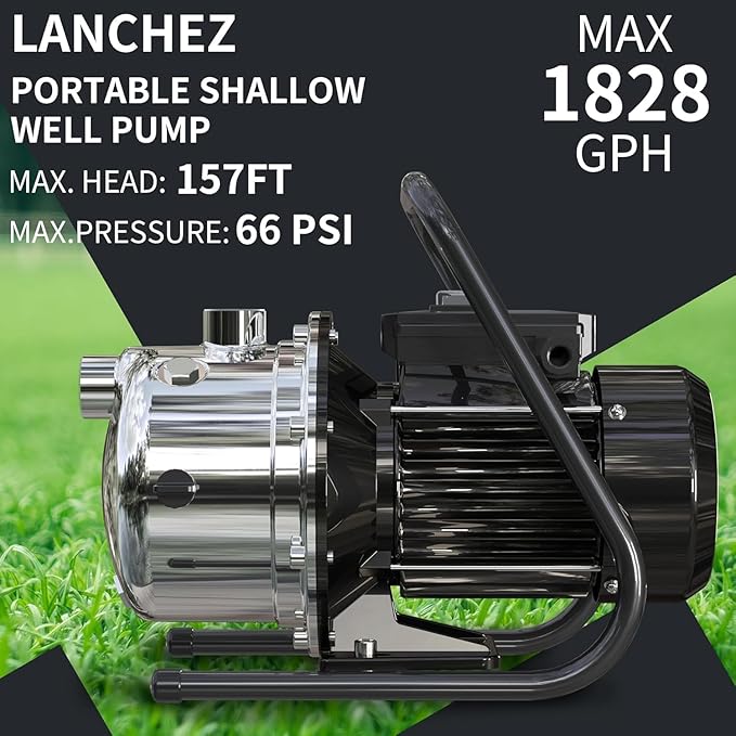 LANCHEZ 1.2 HP Portable Shallow Well Garden Pump, 1828 GPH Stainless Steel Sprinkler Pump, 115V Water Transfer Draining Irrigation for Lawn