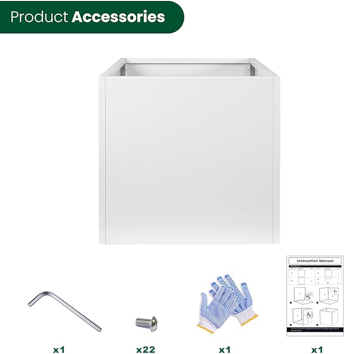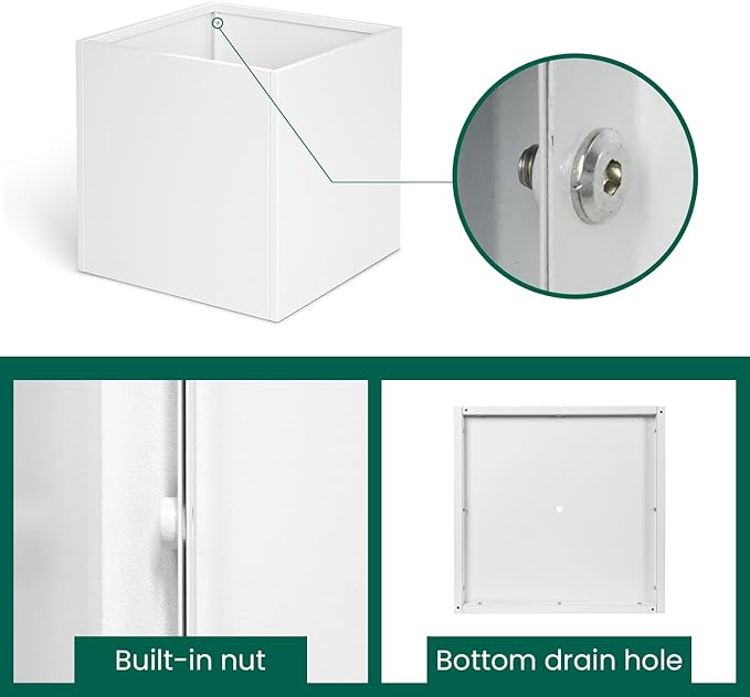 • Galvanized Steel Planter 16" L x 16" W x 16" H. Heavy Duty Galvanized Steel Planter. Easy to Install. Package: 4 sides and a bottom surface with 1 drainage hole, Installation Manual x 1, M5 Allen wrench x 1, screw x 22, gloves x 1.