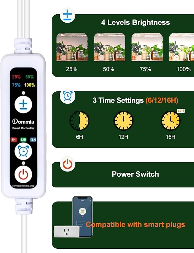 • Dimmable LED Grow Light: Our indoor grow lights for plants are equipped with four adjustable brightness 25%, 50%, 75%, to 100%, allowing you to customize the lighting intensity for your plants' specific needs