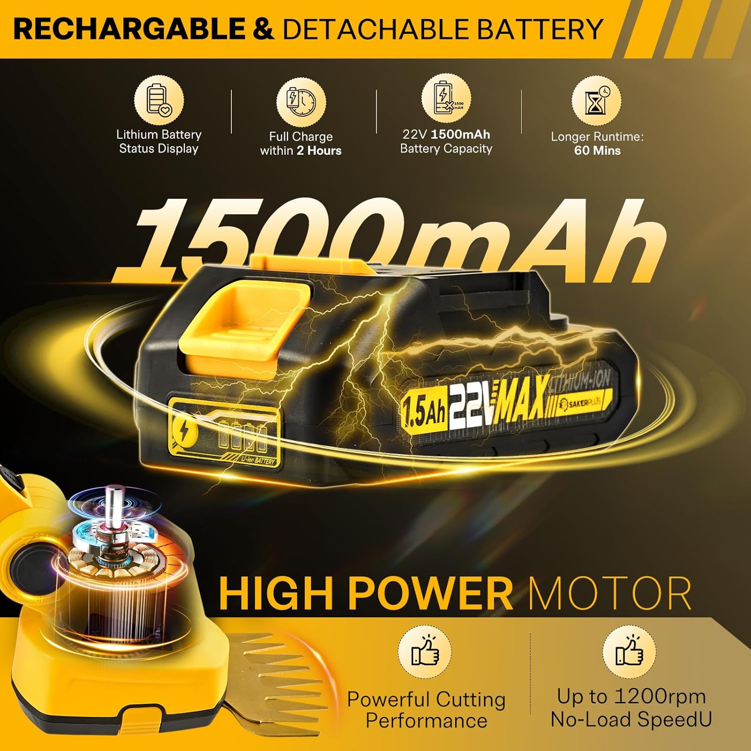 • 【RECHARGEABLE BATTERY WITH INDICATION】SakerPlus hand held hedge trimmer is powered by a rechargeable and detachable lithium battery (20V 1500mAh), providing hassle-free operation. Fully charged in 2 hours, it offers approximately 60 minutes of working time, allowing you to work anywhere without the constraints of electrical outlets or extension cords. Monitor the battery level to ensure sakerplus grass shear has ample power to complete your gardening or pruning tasks without interruptions.