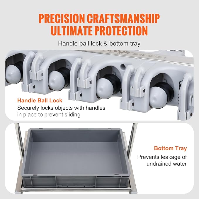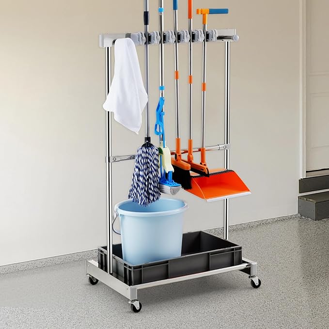 • Convenience at Its Best: The lawn tool organizer comes with 4 swivel wheels (2 of them with brakes) for easy movement between spots. It's got your back with a handy PP tray at the bottom that stops wet mops from dripping and keeps your floor squeaky clean.