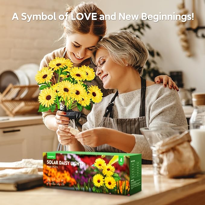4 Pack Outdoor Solar Garden Lights with 16 Glowing Daisy Flowers & Stems, Waterproof Auto ON/Off Solar Flowers Lights for Yard Patio