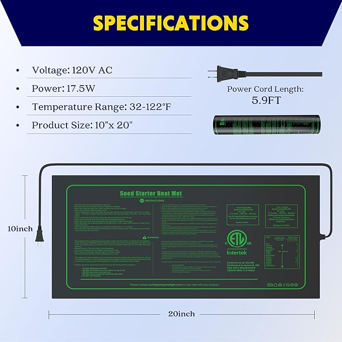 • Heating pad specifications: Size: 10*20 Inch; Wattage: 17.5W; Voltage: 120V; Material: PVC;Protect cold-sensitive plants and improve plant survival rate.