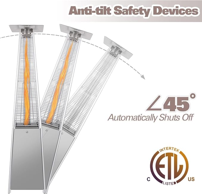• Good Protection: The outdoor propane heaters for patio has anti-tilt safety devices, which will automatically shuts off the heater when tilted over 45 degrees. Waterproof cover can protect the heater in bad weather or when not use and extend life.