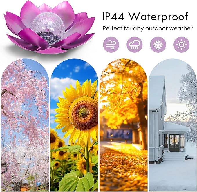 • 【Larger Capacity & Waterproof Lotus Solar Lights for Outside】: Our garden solar lights outdoor waterproof are solar powered, these lights can be completely placed in your outdoor area. Built-in high-quality 1.2 V Ni-MH AAA 600MAH battery. When the battery is fully charged in full sunlight, the decorative lights will be on for 6 to 8hours at night,The IPX4 waterproof rating ensures that outdoor solar lights can withstand all kinds of harsh climates.We've effectively addressed the issue of short lighting duration on cloudy days, ensuring that the light remains bright even during overcast weather.