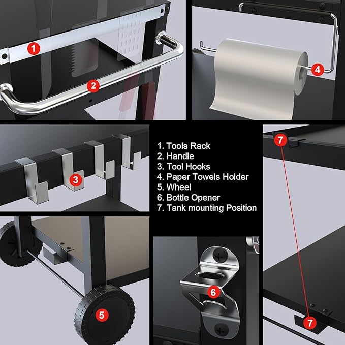 • Wheels for Easy Mobility: Designed for convenience, this grill cart is equipped with 2 wheels, making it effortlessly movable. Whether you're setting up a barbecue on the patio or taking it on a camping trip, the cart provides mobility without sacrificing stability.