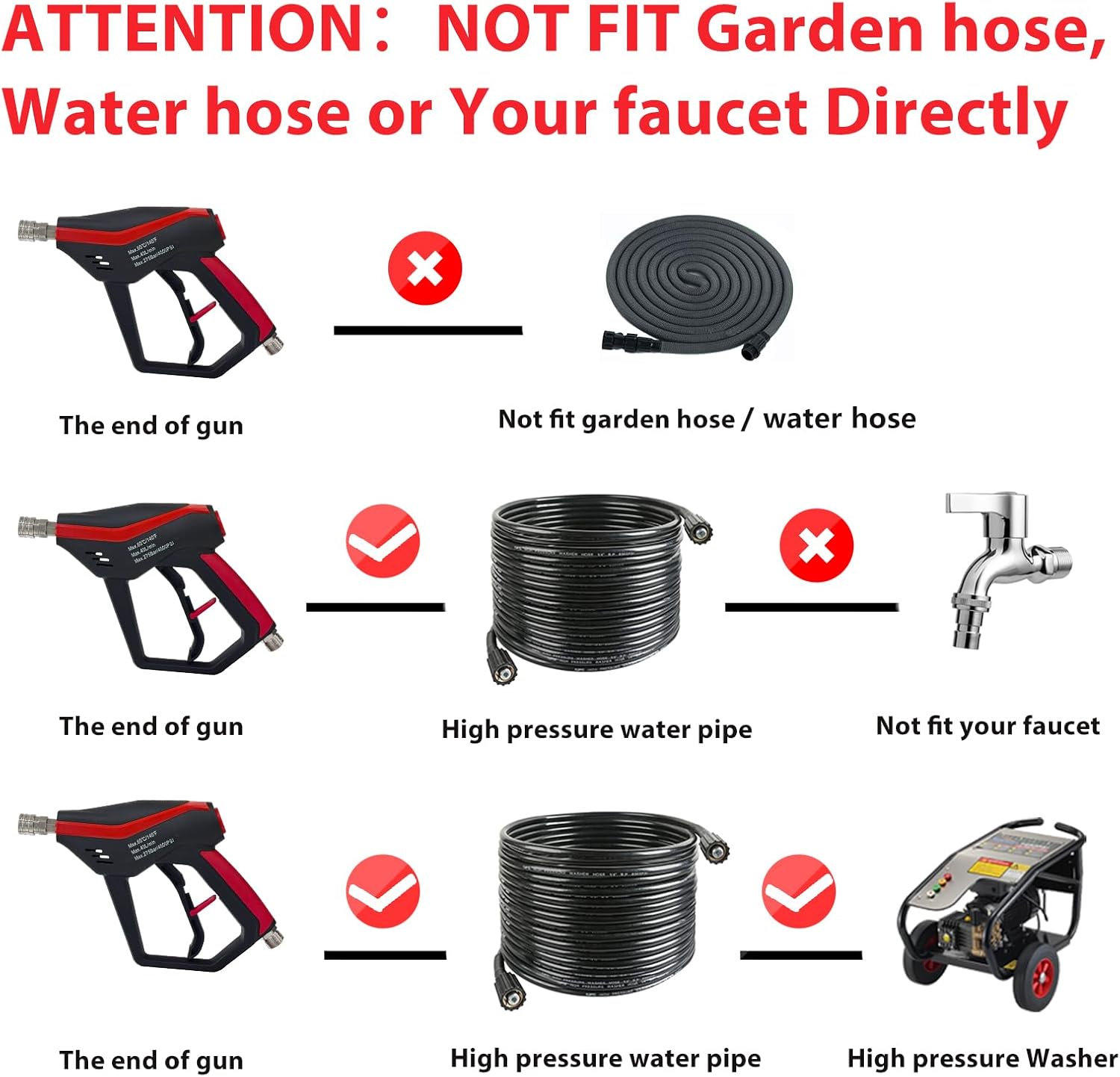 • ❀【Attention】Not Fit GardenHose, WaterHose or YourFaucet Directly, it must be connected to the hose of the high pressure washer before it can be used normally.