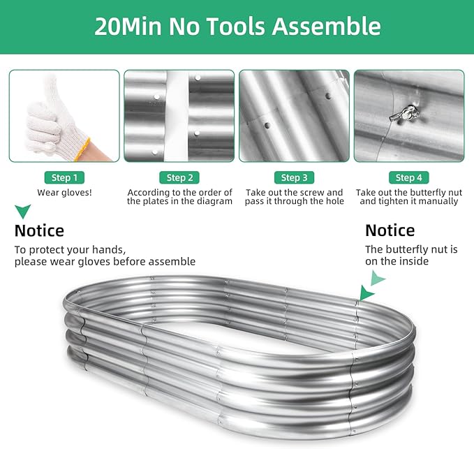 • 【Assembly without Tools】:Our galvanized planter for outdoor plants has been upgraded its accessories with new type of butterfly nuts. Assembly does not require tools, only manual rotation of the butterfly nut is required to tighten two galvanized sheets. More stable than regular nuts, easy to assemble. Notice: Galvanized sheet is heavy, we suggest wearing our gloves for operation.