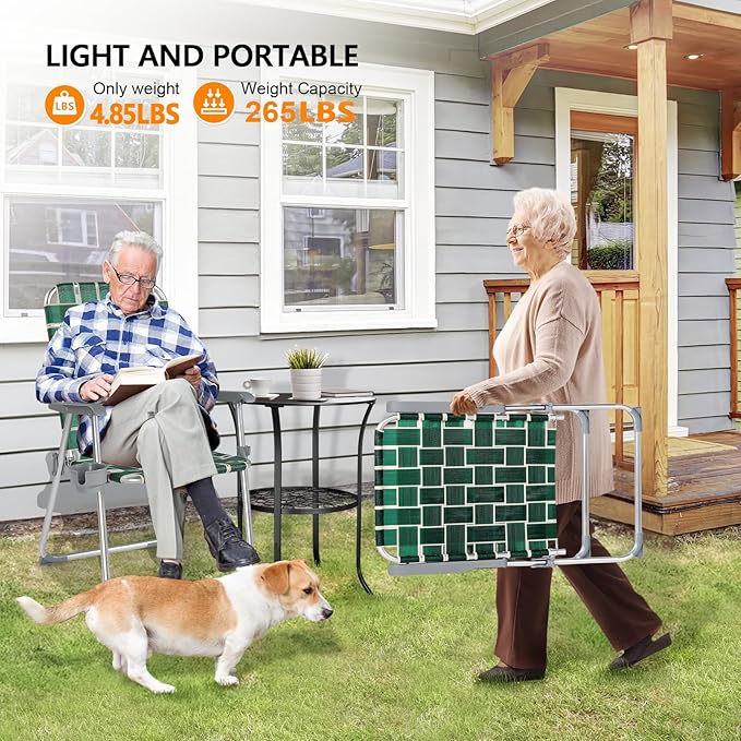 VINGLI Folding Aluminum Webbed Lawn Chairs with Detachable Cup Holder, High Beach Chair for Adults Heavy Duty, Portable Patio Chair, Camping Chair for Yard, Garden, 2 Pack