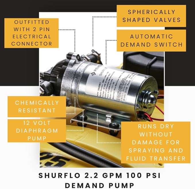 • PUMP PROVIDES POWER: 12V SHFLO pump outputs 2.2 GPM and 100 PSI. Reliable pressure ensures even spraying for herbicides, insecticides, and fertilizers across small farms or lawns